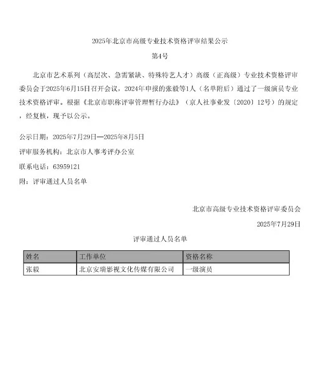 2025年7月29日,北京市高級專業技術資格評審委員會發布公示,綠設計師張譯(公示名“張毅”)通過一級演員(正高級職稱)專業技術資格評審。